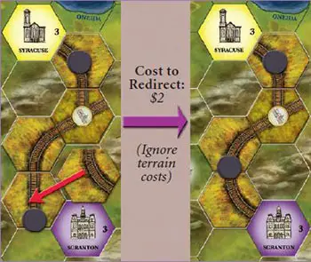 You may "redirect" (change) the last track tile placed in an incomplete link so that its track exits in a different direction. You can only redirect an unowned, incomplete link if it either starts at a city or it directly connects to one of your own links.