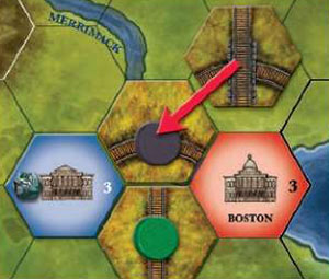 The first tile of track that you build in the game must touch a city hex, so that the track emerges from the city. Mark any track starting a new link with a player token B. As you build more track, you must either extend the track that you have already built A (placing the next piece of track connected to the previous one) or start a new link from any city on the board (but not a town) B.