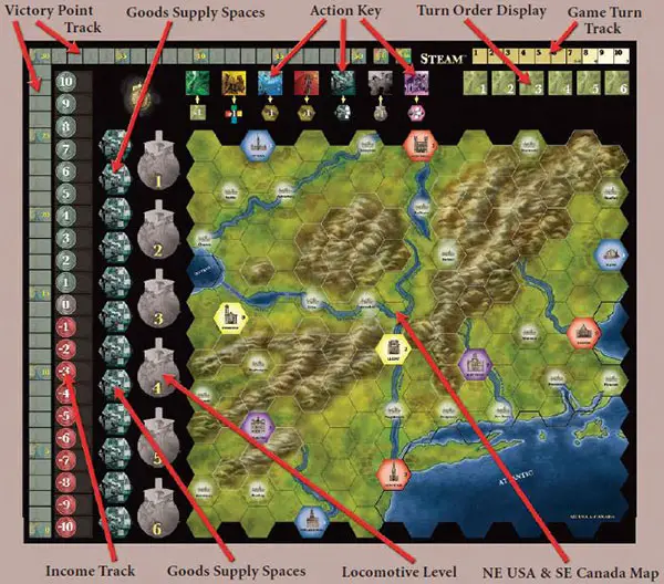 Steam is a game about building railroads and delivering goods along the network of tracks. You build the tracks and improve your locomotive to make the longest, most profitable deliveries possible. Moving goods around the map scores points that add to your income or victory points.