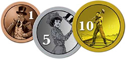 - 68 Money Tokens (1s in copper, 5s in silver, 10s in gold)