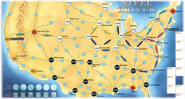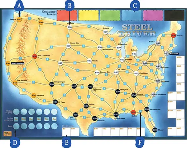 Only one track link can be built along a potential route. Once a track link has been placed it cannot be moved or removed. When a track link is placed the value in the location to which it just connected is added to the active company's profit level.