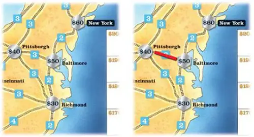 He moves the red token up to the $40 space on the profit track. Note that he could not choose to add the value in Baltimore instead as he could not start the build from Pittsburgh.