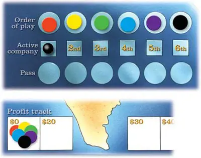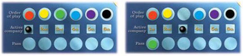 The top row is used to show the present order of play. One of the two black game markers should be moved along the middle row to indicate which company is presently active.