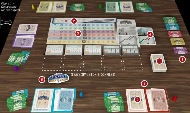 Note: The cards can either be placed in the same Stockpile or different Stockpiles. Cards may not be placed in the 4 or 5 player Stockpiles if there are not enough players in the game. Be sure to fan the cards out so everyone can see how many cards are in each Stockpile.