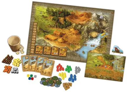 Then he can add as many of his tools to the total from the roll. For each full 2 of the thrown total, he takes 1 food from the game board.