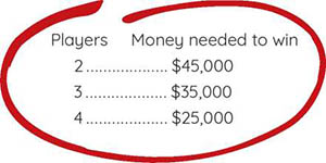 Be the first player to collect enough cash to retire. The amount needed changes based on the number of players.