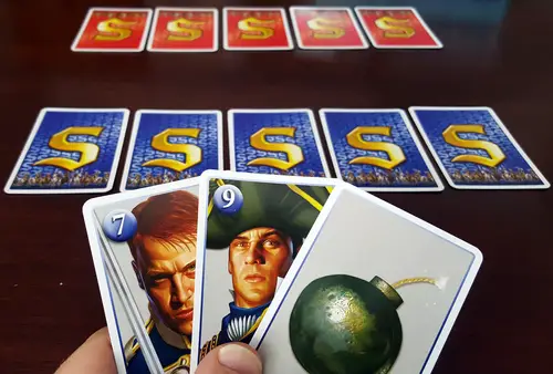 Choose 5 cards from those 8 to make up your front line. Place those 5 cards face down in a row on the table. The 3 cards that remain will make up your hand.