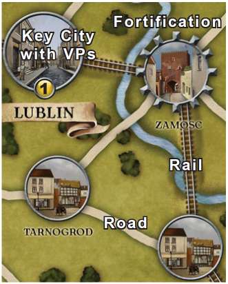 Controlled key cities are worth victory points (VPs), which are designated by a VP value within a yellow circle.