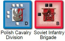 Blue blocks represent the Polish Alliance forces and red blocks represent the Soviet Alliance forces. Each block has squares depicted along its sides. Each square represents a Strength Point (SP).