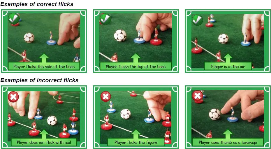 Offense: Figures moved in a way other than the 'Flick-to-Kick' method, including positional flicks, onside flicks and blocking flicks. One figure kicking the ball more than three times in a row.