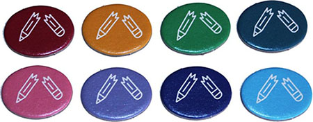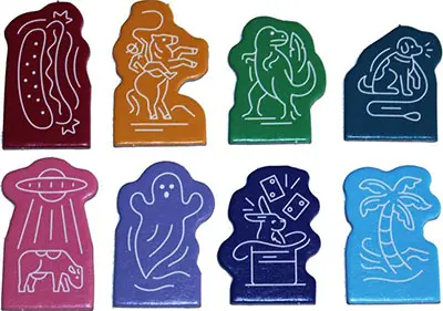 Place your Guessing Tokens face down with the broken pencil side showing up in front of you. Look at the drawings on the right side of the Game Board and compare them to the drawing of the Dealer.
