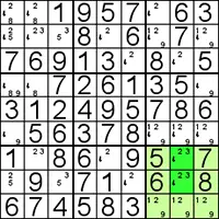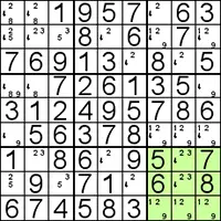We kunnen nu de andere 4 in de verticale lijn buiten vak 9 elimineren. Door het elimineren hebben we nu een enkele kandidaat nummer 2, in de rechter bovenvak. |