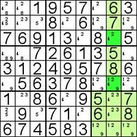 We can now eliminate the other 4's in the vertical line outside box 9. We can see now that we have a single candidate, number 2, in the right upper blox. |