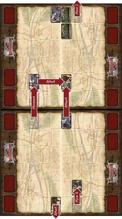 When moving, you may move from 1 Battlefield to the other, either by moving across the sides of the Battlefield Boards that are next to each other, or by moving from one far side of the Battlefield to the other far side of the Battlefield. Note: moving and attacking from one far side of the Battlefield to the other is not a legal move in the 2 player game.