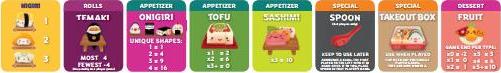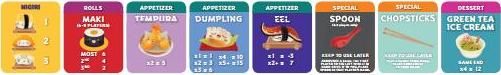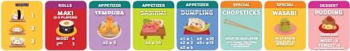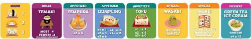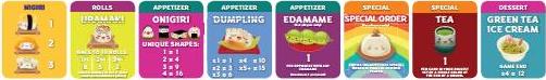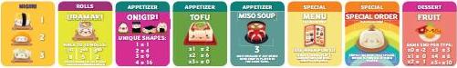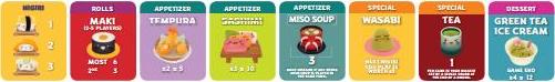 Note: When playing with maki rolls in a 6-8 player game, flip its menu tile over to show the 6-8 player game scoring.Shuffle the chosen dessert cards and place them in a face-down pile to one side of the board.