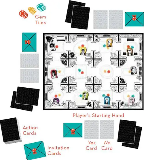Shuffle the Invitation cards and deal one card face-down to each player. This is your guest identity; keep it secret from the other players. Put the remaining Invitation cards face-down in a deck.