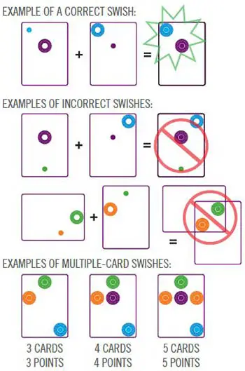 A Swish is created by layering two or more cards so that every ball swishes into a hoop of the same color. The cards may be rotated and/or flipped but must lay on top of each other in the same orientation, and no hoop or ball can be left unmatched.