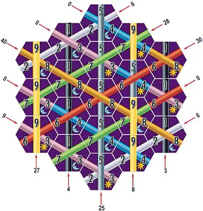 Please note that the individual tiles are marked with either "suns" or "moons". These symbols have no significance when playing the 'standard' game of Take It Easy!, and can be regarded as being for decoration only. However, at the end of this rulebook, several game variants are suggested, in which the sun and moon symbols are used.