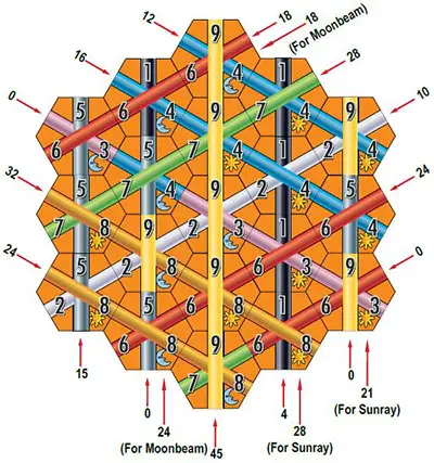 For every Sunray you complete, score 7 points for each tile in that Sunray. For every Moonbeam you complete, score 6 points for each tile within it. These scores are added to the points you have obtained for normal Scoring Rows. The scoring in an example game of "Sunrays and Moonbeams" is shown below.