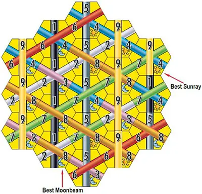 This variant is suitable for between two and six players. It involves a strong interactive element, as players are competing to have the 'best' Sunray, and the 'best' Moonbeam. For this game, Sunrays and Moonbeams only count if they are formed along Scoring Rows. A Sunray or Moonbeam along a non-scoring row is not valid in this version.
