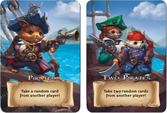 On your turn, you can play a Pirate to take a random card from another player; or a Two Pirates card to take up to two random cards.