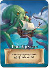 It's all fun and games until someone unleashes the Kraken! Playing The Kraken on someone makes them discard their entire hand, UNLESS they have the Pirate Captain!