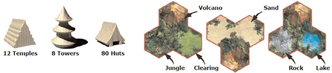 Each player chooses a color and places the corresponding Temples, Towers and Huts in front of him as his construction pool.