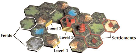 Settlement: All fields that are connected by building pieces of the same color make up a Settlement of that color. A Settlement starts with a single Hut and can expand from thereon.