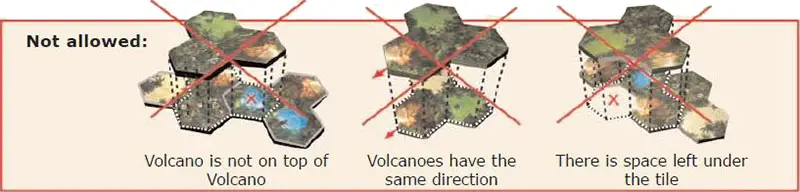 Building pieces may only be placed on empty fields. You cannot build on a Volcano. It is allowed to connect two of your own Settlements to each other.