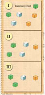 A three player game starts with only the cubes in Zone I on the board. Place one green cube on the Tammany Hall ward and randomly place the other cubes indicated in the other wards in Zone I, one cube per ward.