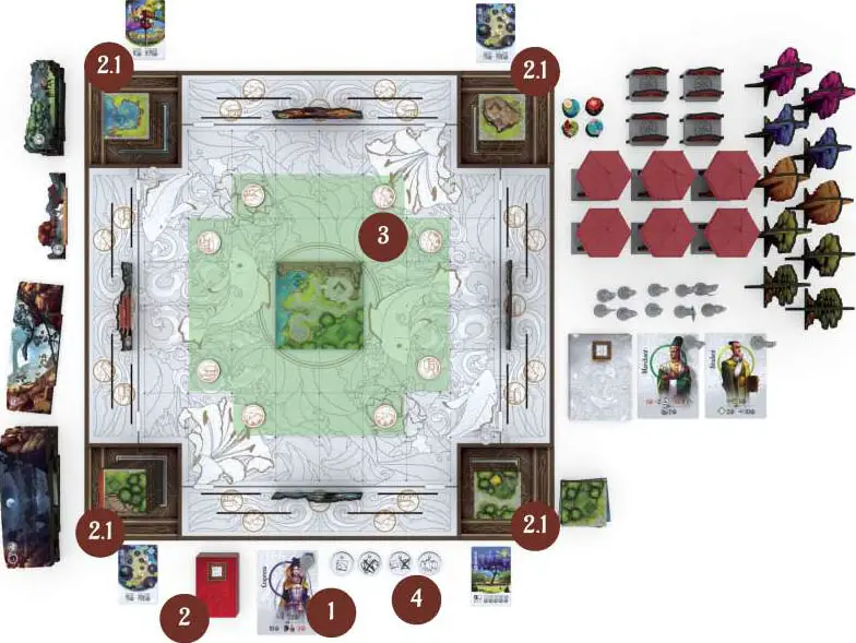 2.1 Reveal the top four decoration cards and place one face up, next to each garden tile stack.
