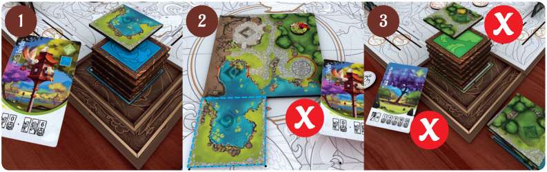Once the pair is selected 1, place both the tile and the decoration on the board according to the game rules, then discard the decoration card to a discard pile 2. Find the garden tile and decoration card in the opposite corner from the pair you selected 3.