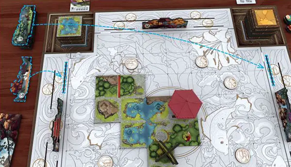 Shuffle four small landscape tokens and four big landscape tokens. Place them face up in the spaces indicated in the setup diagram above.
