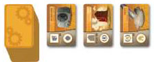 2 Tech cards (x33): Shuffle the tech cards. Place the deck face down next to the board and reveal 3 cards.
