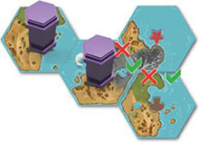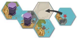 First, select 1 territory tile from your supply and place it on an unexplored hex adjacent to a territory you control, oriented in any direction: