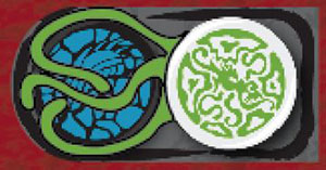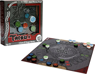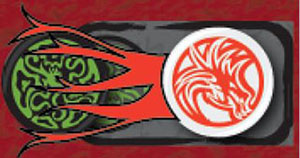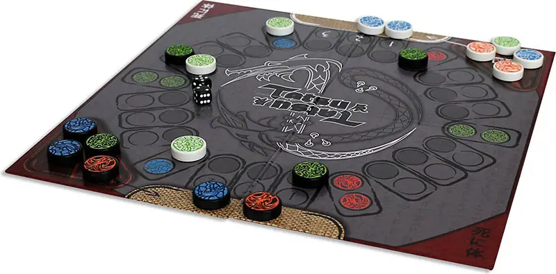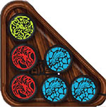 Players take turns rolling the 2 dice and moving their stones around the inner ring of the Arena, from segment to segment. Black moves clockwise and white moves anti-clockwise, as indicated by the Dragon images in the center of the board.