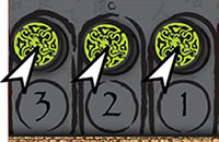 You may use one or both of your dice to move stones from your Mat onto the Arena. The die moving the stone must have a value of either one, two, or three and the stones must be moved onto the segment corresponding to that value, depicted by the numbers at the Arena entry points.