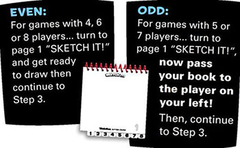 When you're finished sketchin' or guessin, flip forward a page and wait until all players are ready. Everyone passes open books at the same time.