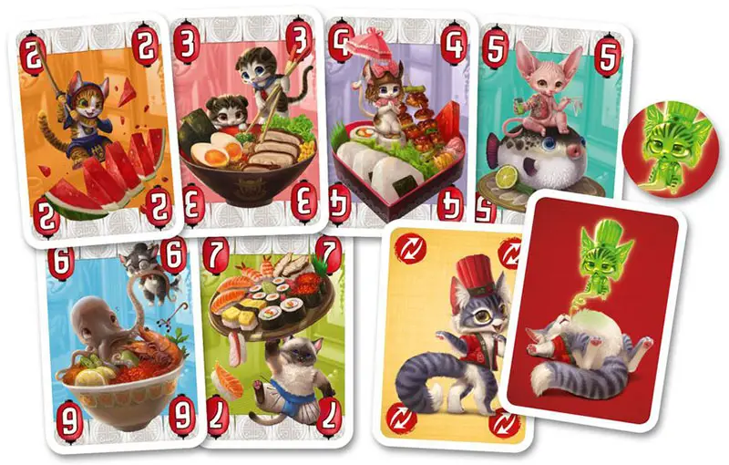 On your turn, you may draw cards to eat the dishes offered to you by other cats, or play cards onto the stack to serve them to your neighbor.