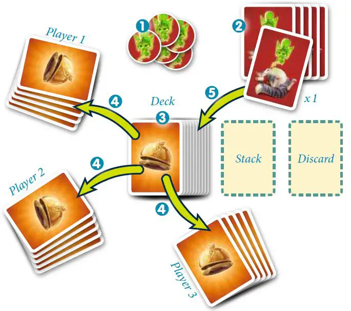 The first player in a round chooses a Dish card from his hand and begins a stack by placing it face-up in the center of the table. Then, the player to the left begins play by choosing one of four actions.