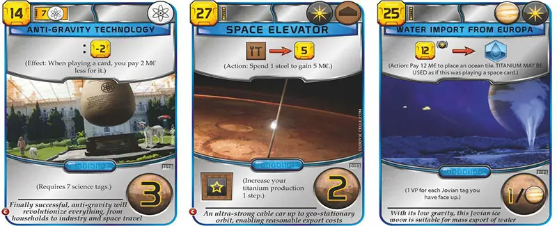 Each player starts the game with a corporation card. During the game, players buy and play many project cards to get benefits of different kinds. The cards are divided into active cards (blue frame, see example), automated cards (green) and event cards (red).