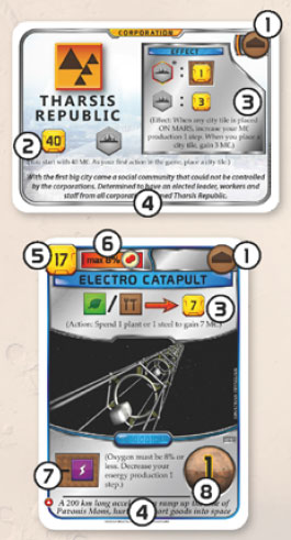 2 Starting conditions: This tells you how much money you start with, as well as other starting resources and production. Some corporations also have a fixed first action described here (see example card).