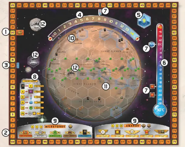 The central game board has tracks for temperature, oxygen level, terraform rating, and generations. There is a surface map where you add ocean tiles, greenery tiles, and city tiles as the game progresses. There is also a list of standard projects available to all players, as well as milestones and awards that players can compete for.