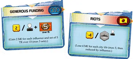 There are 6 different parties, each with a different one-time bonus and a policy (special effect or action), that are applied when they become ruling. To afford giving these bonuses to the players, the Terraforming Committee is also revising Terraform Ratings, causing players to lose 1 TR each generation!