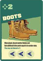 When you play a Boots card, you will also play another Vehicle card from your hand. You gain the displayed number of additional Action Points only and then discard the card.