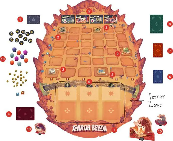 The goal of Terror Below is to be the first player to score 20 Victory Points (VP) by collecting Worm Eggs and delivering them to Locations around town. Or alternatively, by hunting down and killing those vicious Worms.