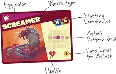 Each Worm card also displays starting coordinates that correlate to the grid on the game board.