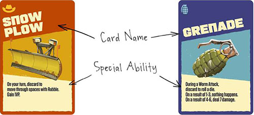 Item cards generally include special abilities that a player may use on their turn to break the rules-many times they will also give the player a VP for doing so. Weapon cards are generally used during a Worm Attack to hunt Worms.