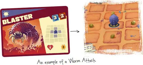 A Worm card shows the Worm's health total. If the combined total of damage dealt to the Worm by all players caught in the attack is equal to or higher than the Worm's health, you have defeated the Worm. Any players caught in the attack are safe. Rubble and Eggs are still placed as usual.