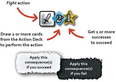 To take these actions, you will use an Action Deck that represents the collective life force of your characters. All actions work the same way: you must pay their X-cost by drawing a minimum required number of cards from the Action Deck, and obtain a minimum required number of Y-successes (depending on the action's difficulty) to perform them successfully. These successes appear in variable amounts on the cards you have just drawn.